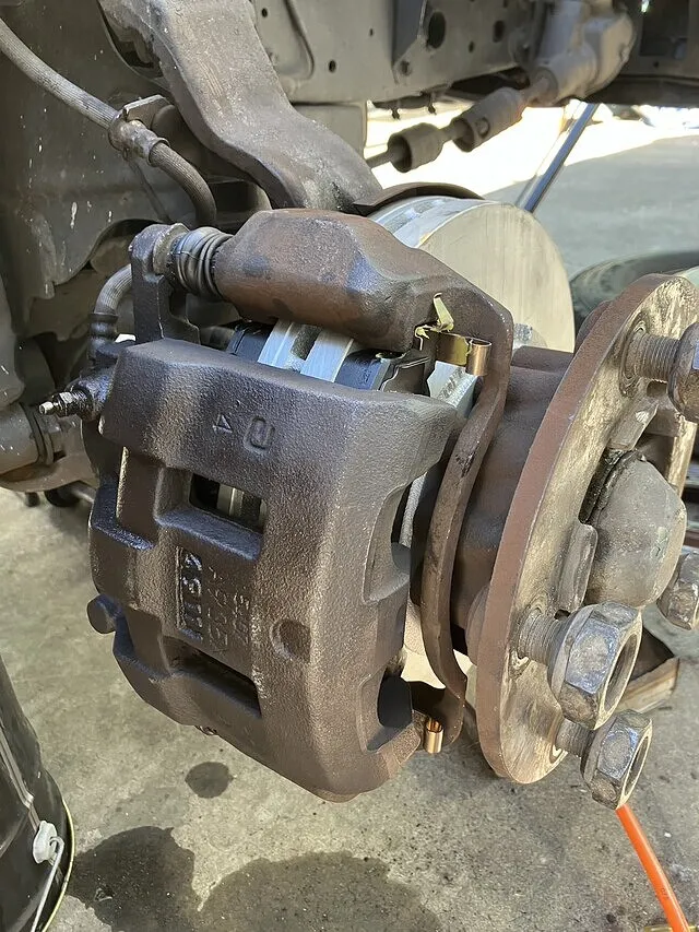 これは2ピストンキャリパー、一般的な乗用車、軽自動車はピストンが1つのものが多いですが2トン以上のトラックは2ピストンが多いですね。またスポーツカーになると対向4ピストンとか装着されてる車もあります。