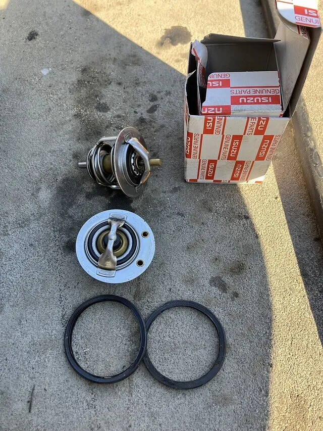 サーモスタットを交換する。見た目には新品のものと何ら変わりない様子、でもこれが早く開いているんですよだから水温があまり上がらない